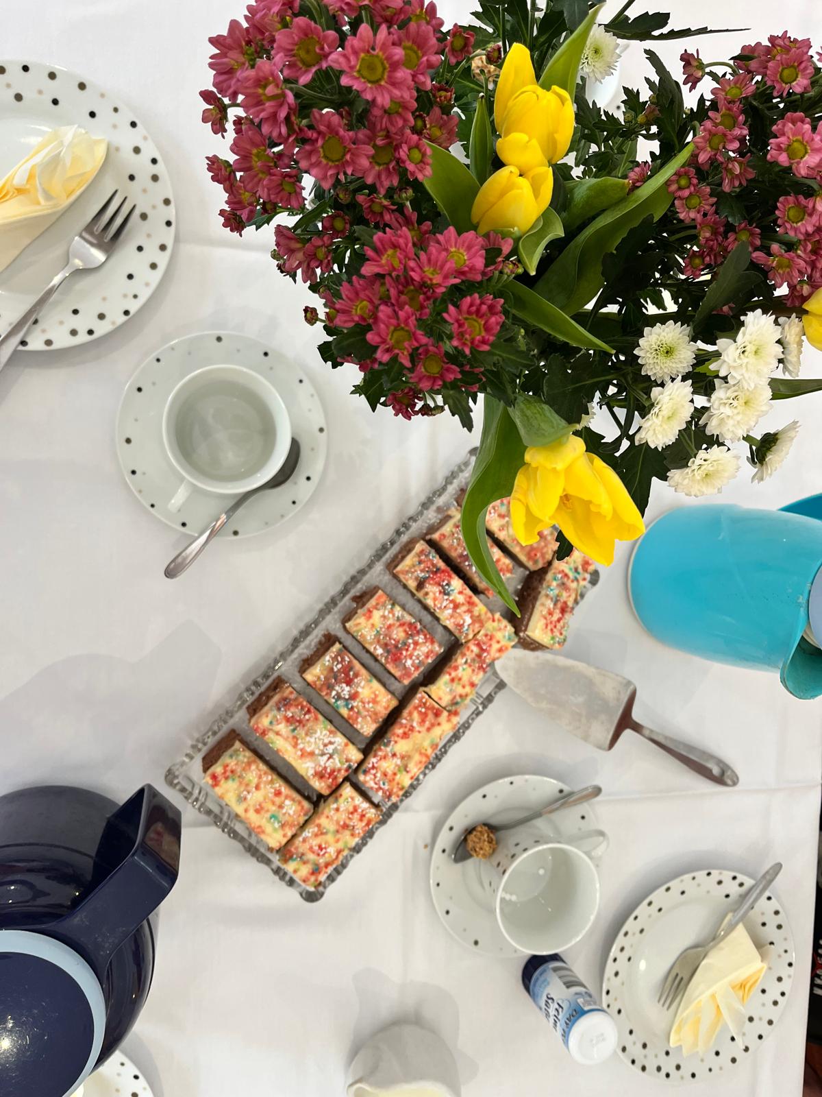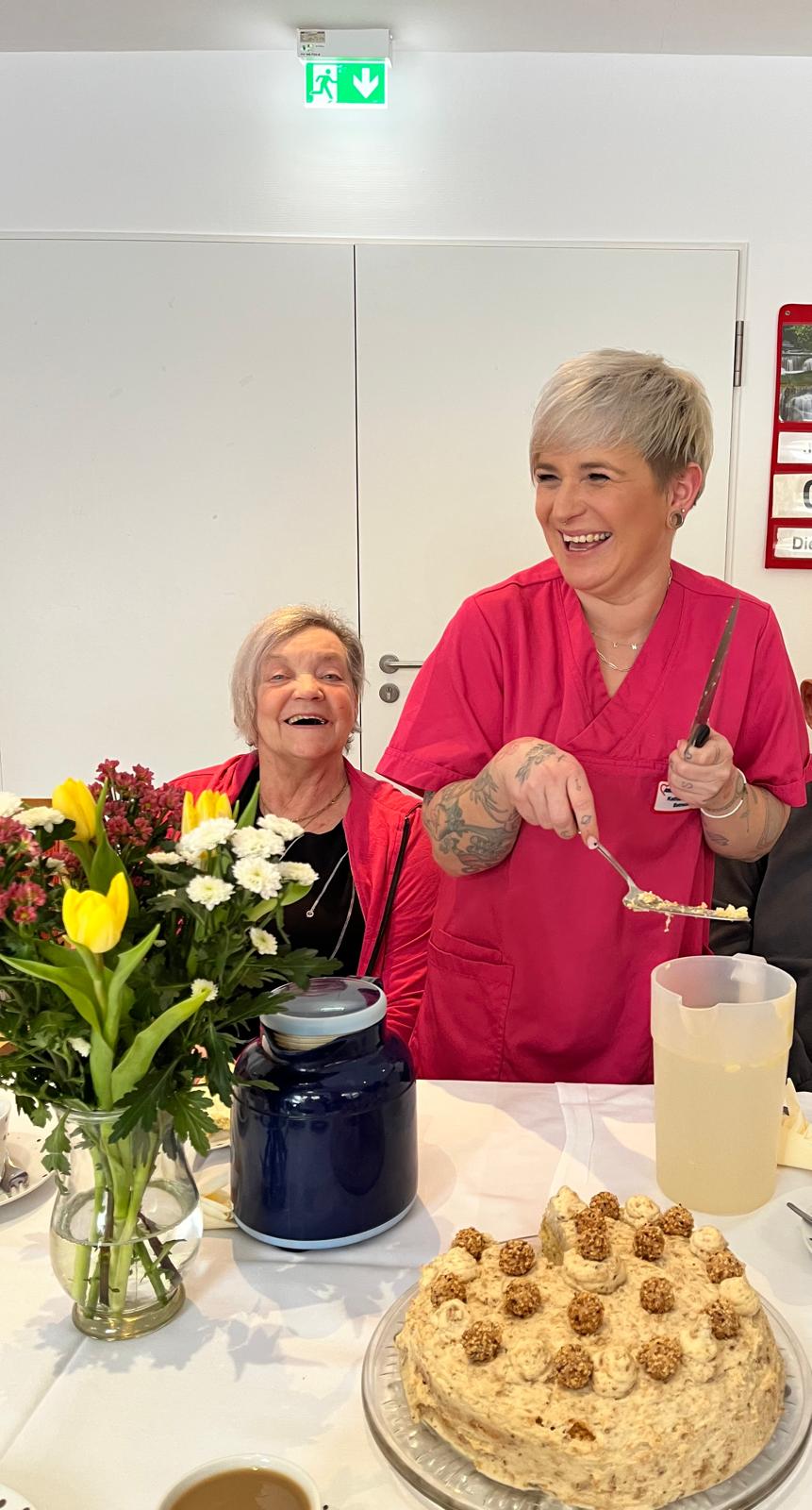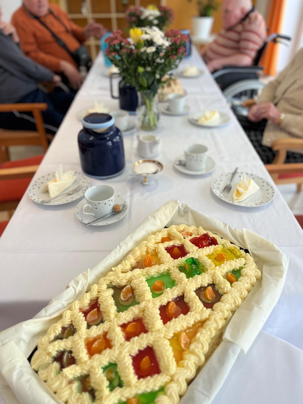 Am 30. April 2025 feierten wir die Geburtstage des ersten Quartals. Unsere Bewohner*innen kamen zusammen, um bei einer festlich gedeckten Kaffeetafel zu plaudern und anzustoßen. Mit köstlicher Torte, Kaffee und Sekt genossen wir den Nachmittag und tauschten Geschichten über vergangene Geburtstagsfeiern und Traditionen aus. Alle erfreuten sich sehr an diesem gemeinsamen Austausch.