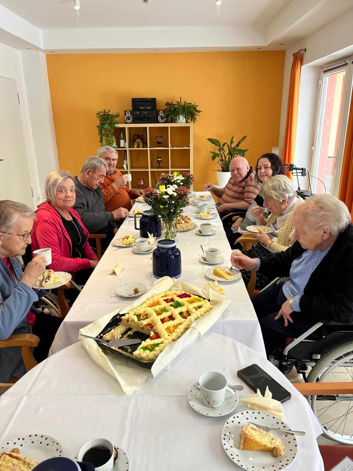 Im April war es wieder soweit: Alle Bewohner unseres Pflegeheims, die im vergangenen Quartal Geburtstag hatten, wurden zur gemeinsamen Feier eingeladen. Dieses Mal war es eine große Runde von 16 Geburtstagskindern. Die Kaffeetafel war festlich gedeckt und es gab für alle Kaffee, Kuchen und mit einem Glas Sekt wurde angestoßen. Es war eine tolle Stimmung bei Musik und lustigen Ratespielen.